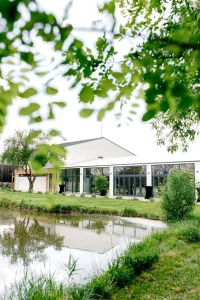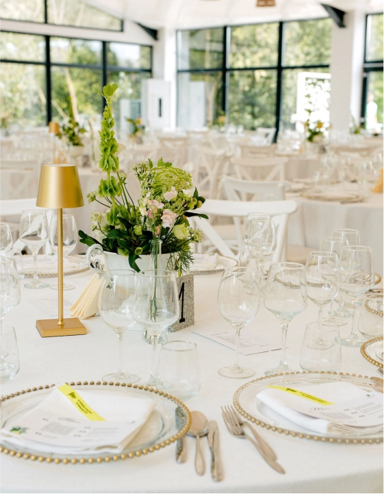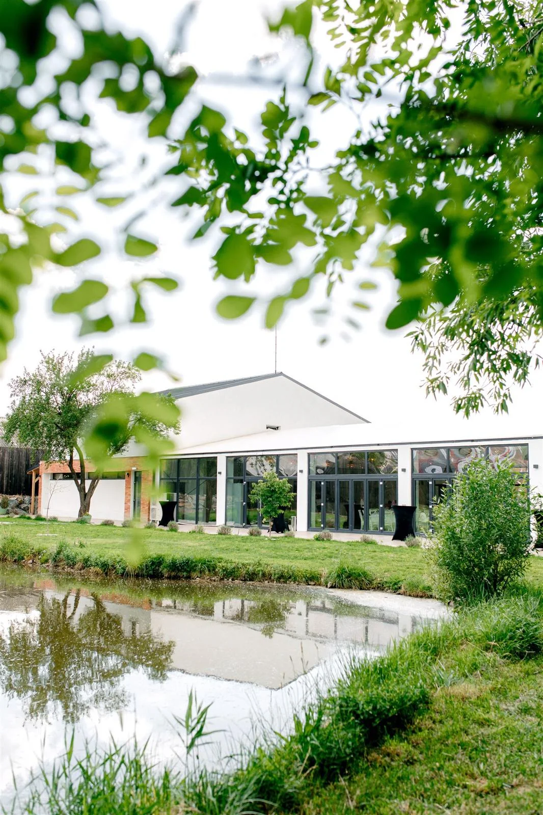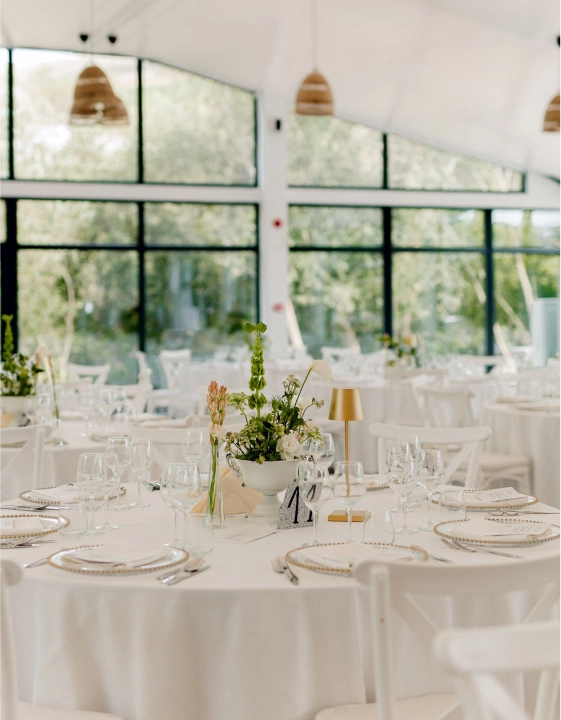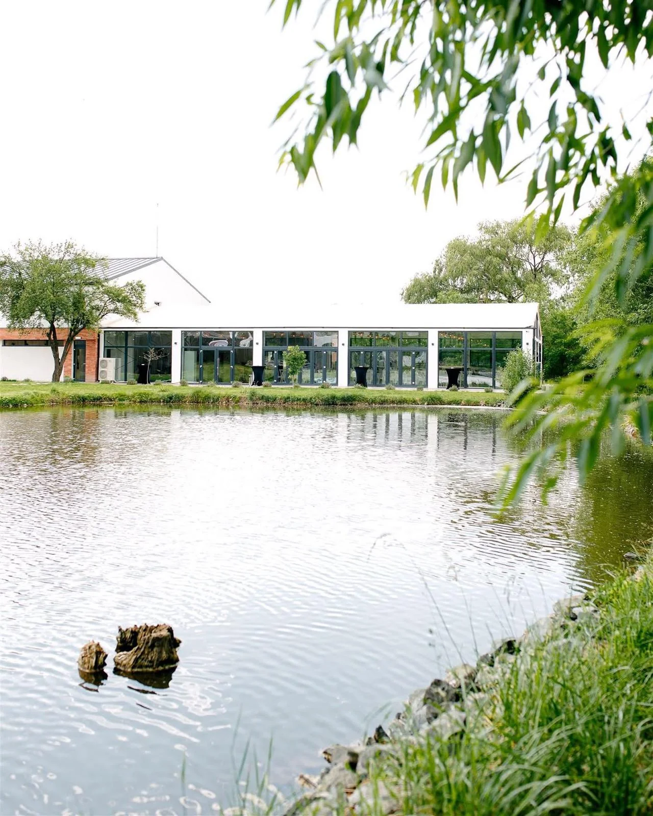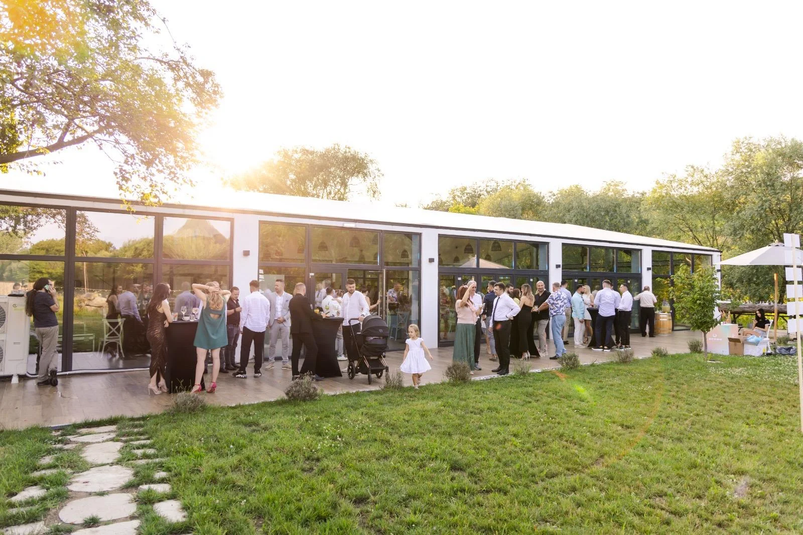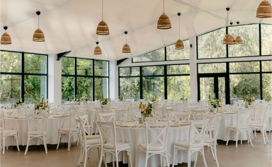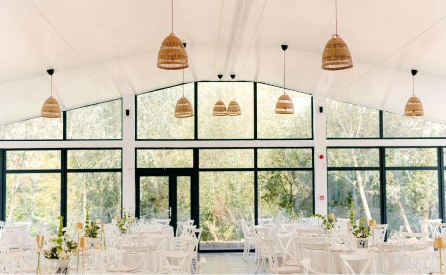 Pereții laterali ai cortului sunt formați din sticlă, oferind acces la terasa minunată din fața lacului. Astfel, în timpul evenimentului invitații dumneavoastră vor putea admira priveliștea spectaculoasă a lacului și se vor relaxa privind vegetația luxuriantă din jur, formată din sălcii și salcâmi. Este un decor fermecător care se potrivește perfect cu design-ul nostru contemporan, creând astfel o armonie între natură și arhitectura modernă.